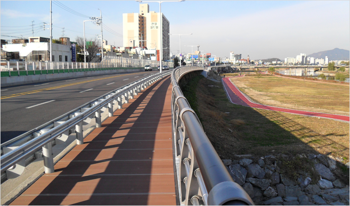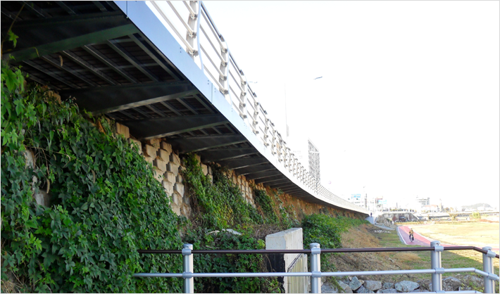 요인들을 이 공법을 통해 자연 친화적으로 개선하였고, 하천의 수질 및 환경이 크게 향상됨. - 콘크리트 사용하지 않는 친환경적인 법면용 조립식 확장보도의 구조적 안정 및 활용