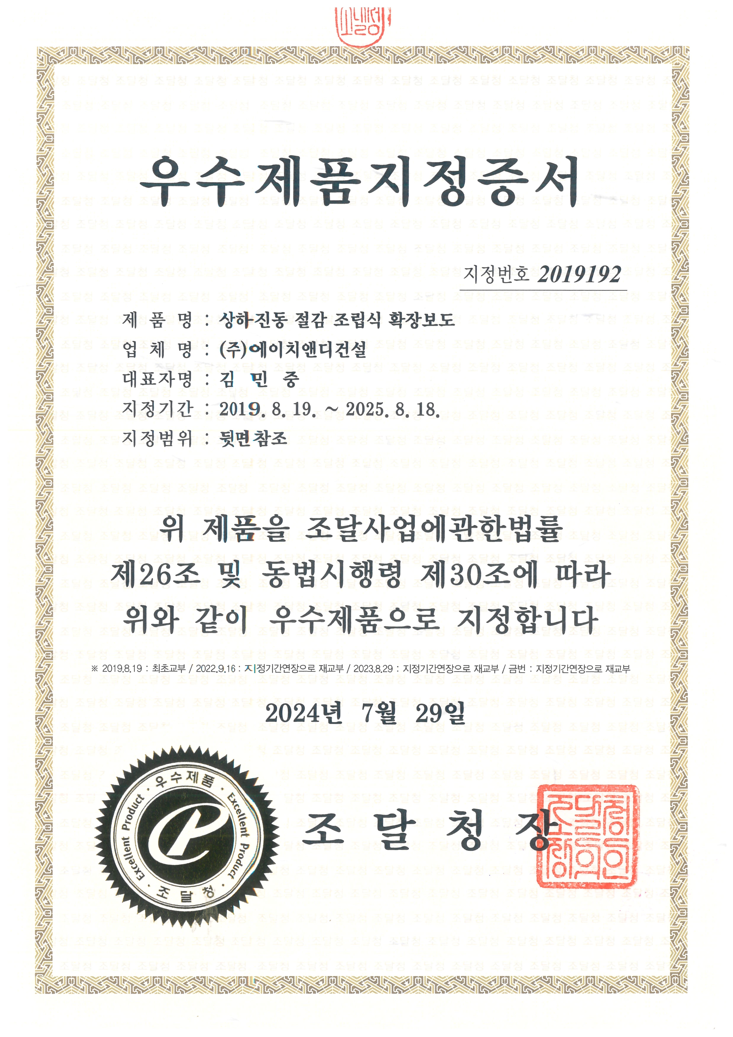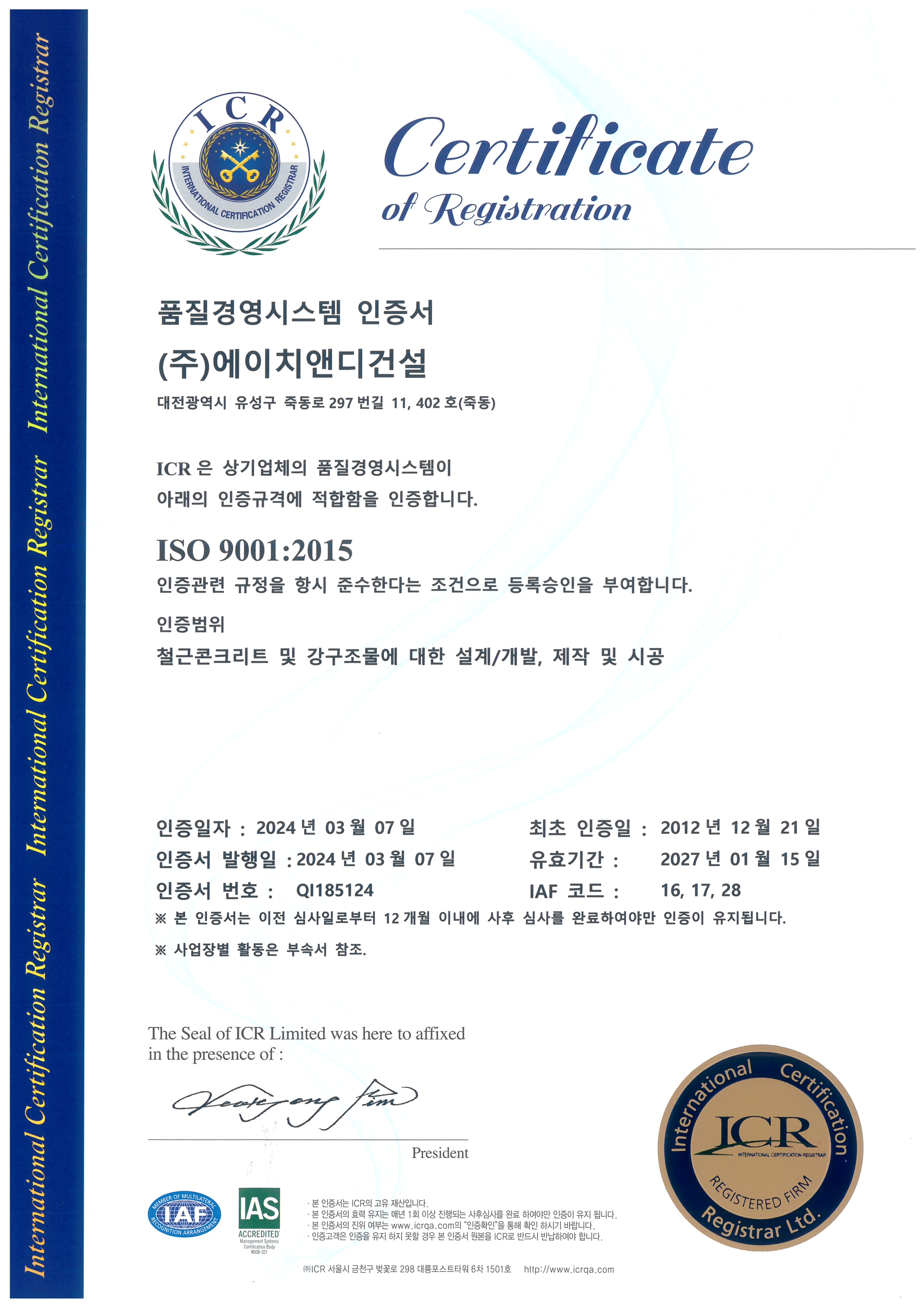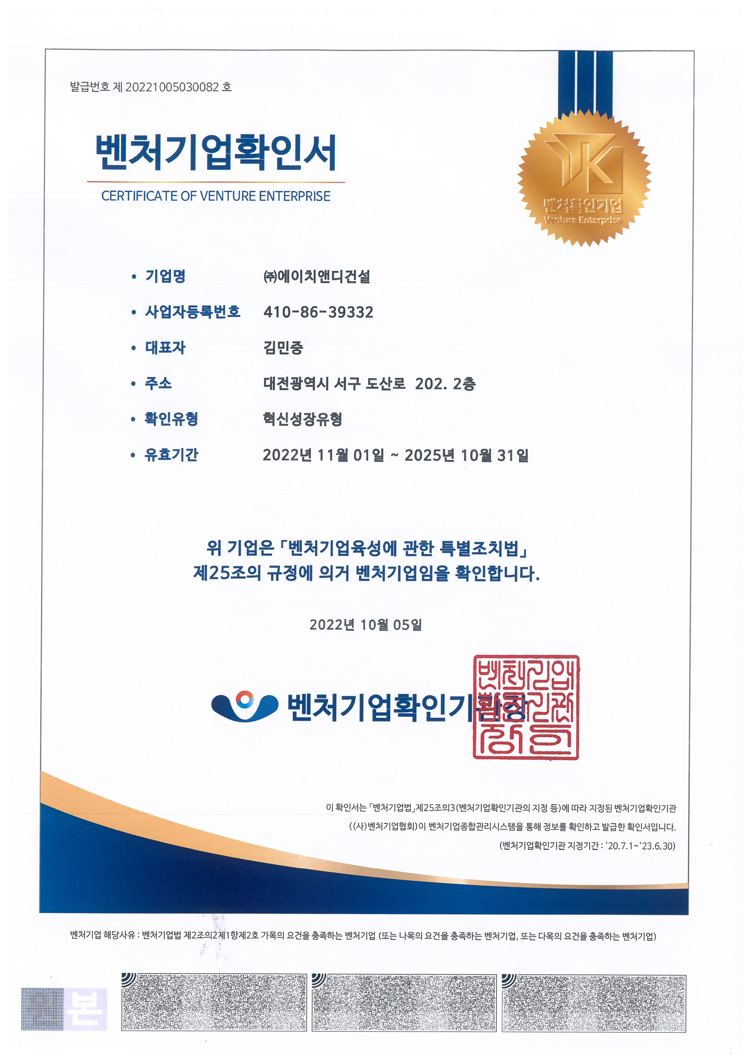 주식회사 에이치앤디건설 대표: 김민중 대전광역시 유성구 죽동로297번길 11 4층, 402호(죽동) 사업자 등록번호: 410-86-39332